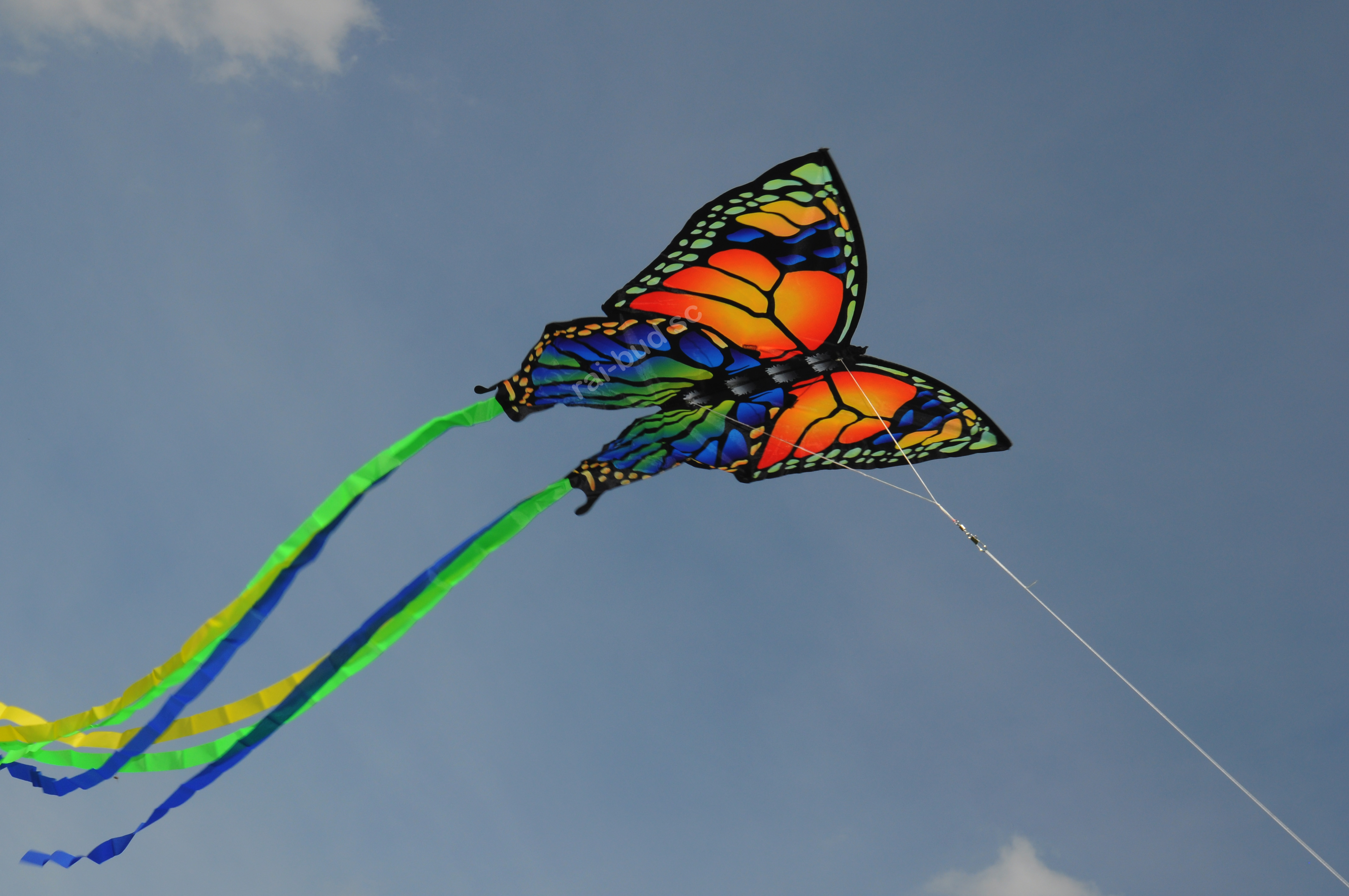 Wspaniały duży, wytrzymały i bardzo kolorowy latawiec z długim ogonem.