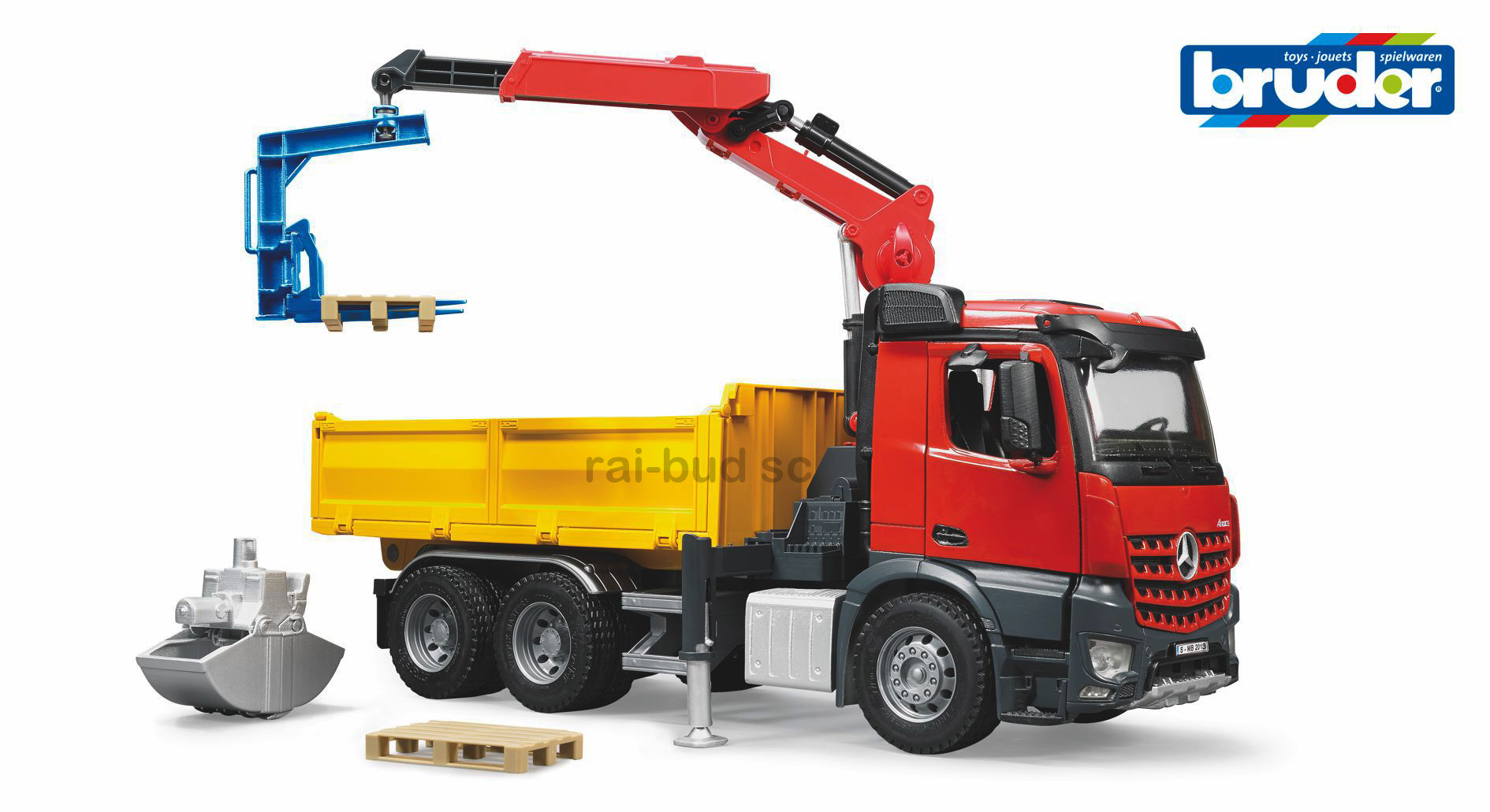 Zawartość opakowania: MERCEDES AROCS Z ŻURAWIEM HDS I AKCESORIAMI
